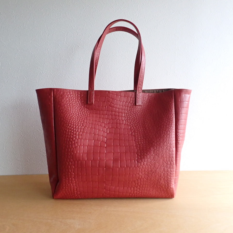たっぷり入る大きなトートバッグながら、高級感を大切にしつつもリーズナブルにご提供するために、独自に革を仕入して、個別に型押しを施してから制作しているバッグです。ますます便利で使いやすく、お仕事やお出かけをフォローいたします☺